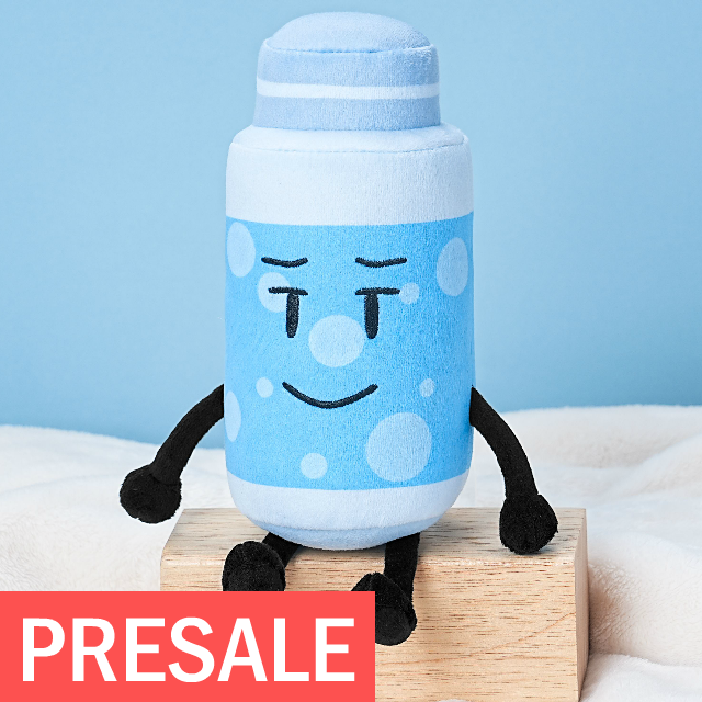 The WATER BOTTLE PLUSH is here! Competitive as ever, she won the first season of The Daily Object Show. She later returned to compete alongside the winners in the 'All Stars' season and helped defeat Evil Computer Supreme in 'Evil Never Dies'. With a feisty nature, she won't stop trying to win whatever she tries at.